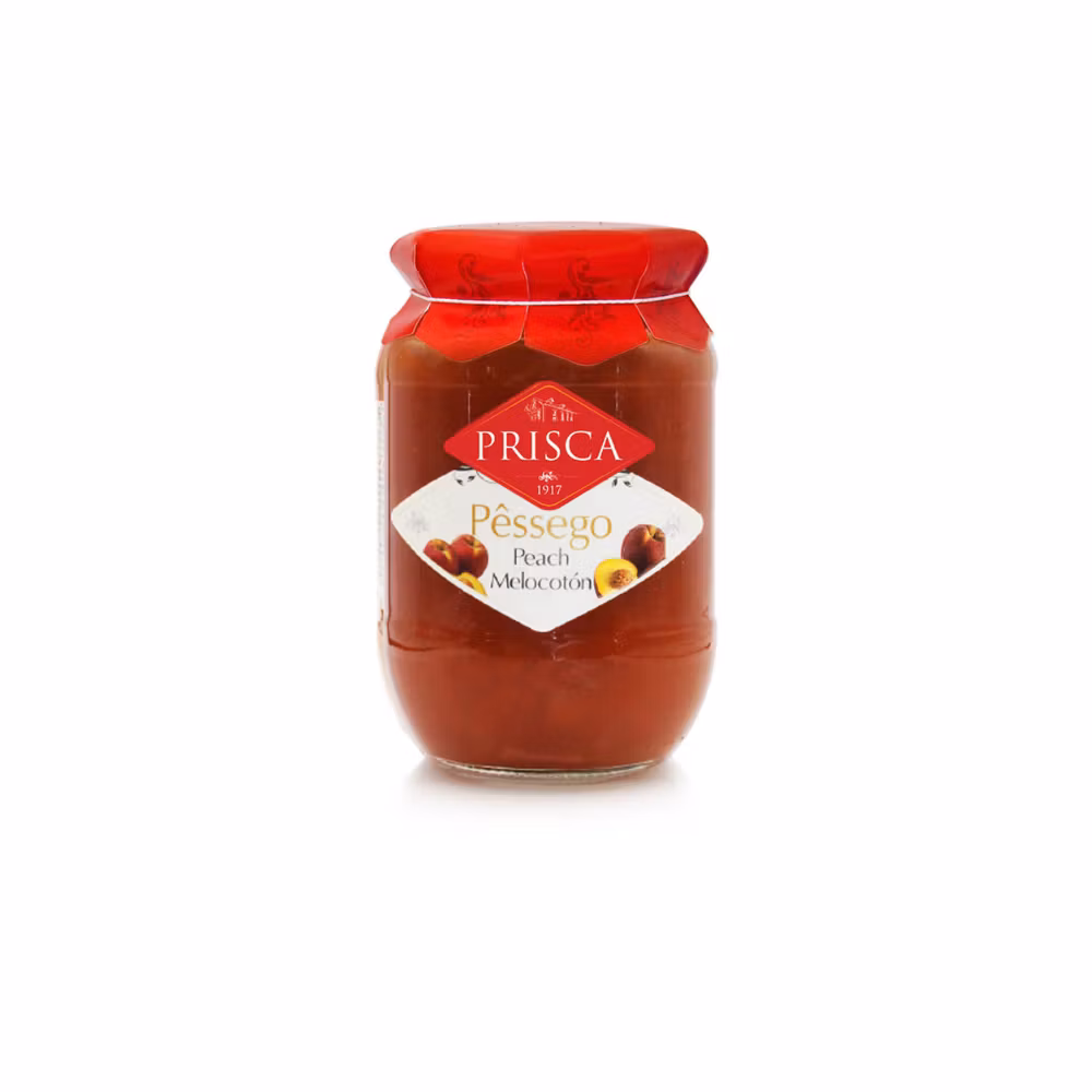 Doce de pêssego från Casa da Prisca är en fruktig marmelad tillverkad med hög andel solmogna persikor, varsamt kokade för att bevara fruktens naturliga smak och arom. Med noggrant utvalda ingredienser som frukt, koncentrerad fruktjuice, pektin och en touch av citron får marmeladen en balanserad sötma och en frisk, lätt syrlig ton.